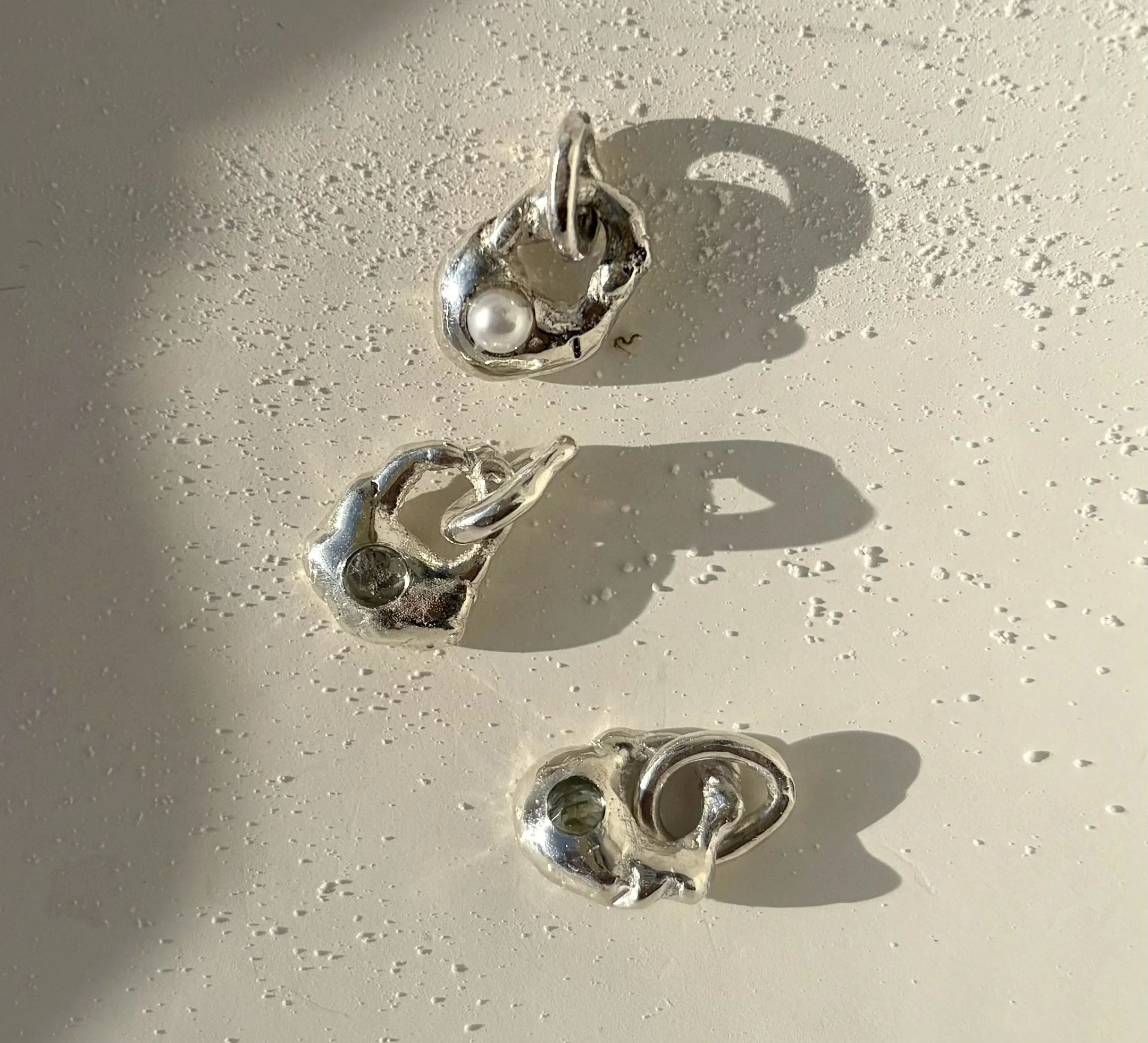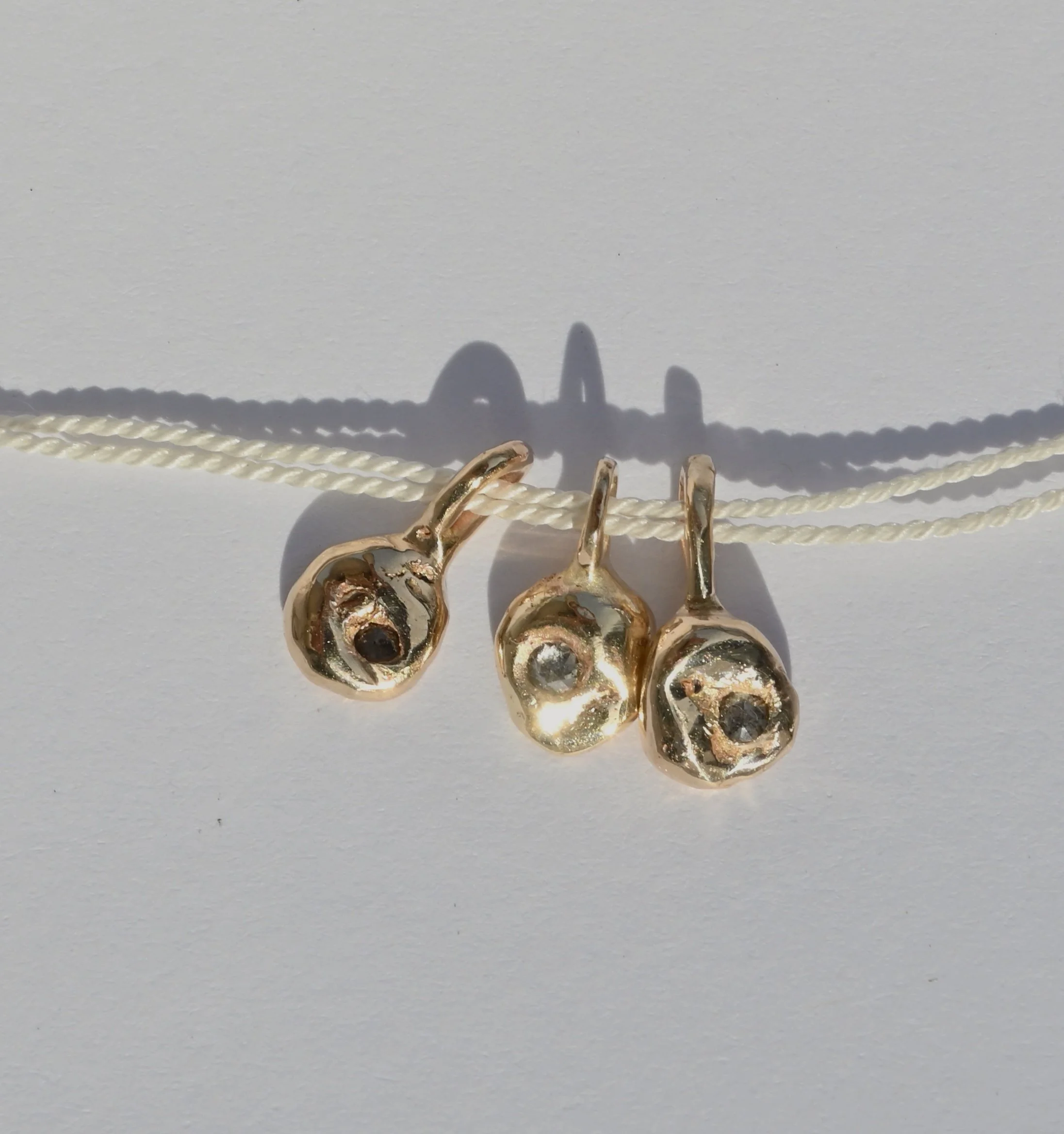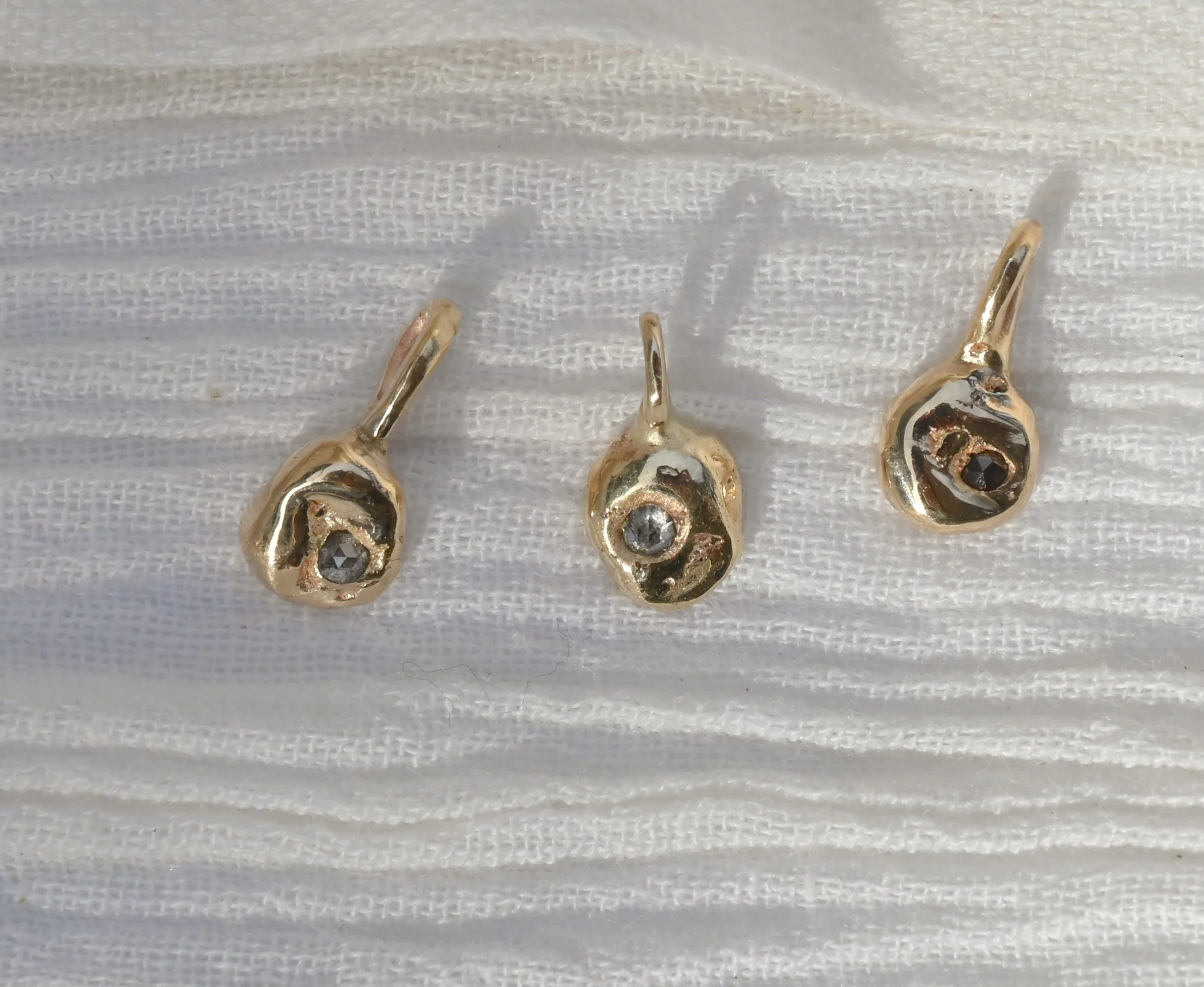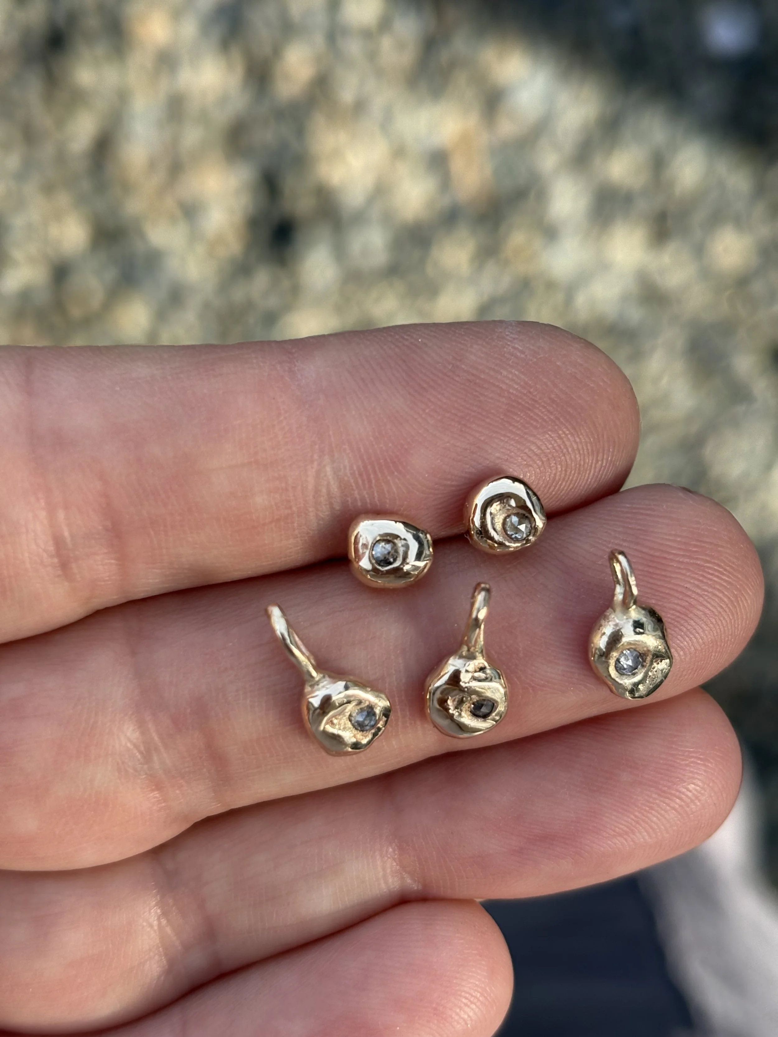 Melted 14k solid gold pebble studs with pressed salt and pepper 2mm diamonds.