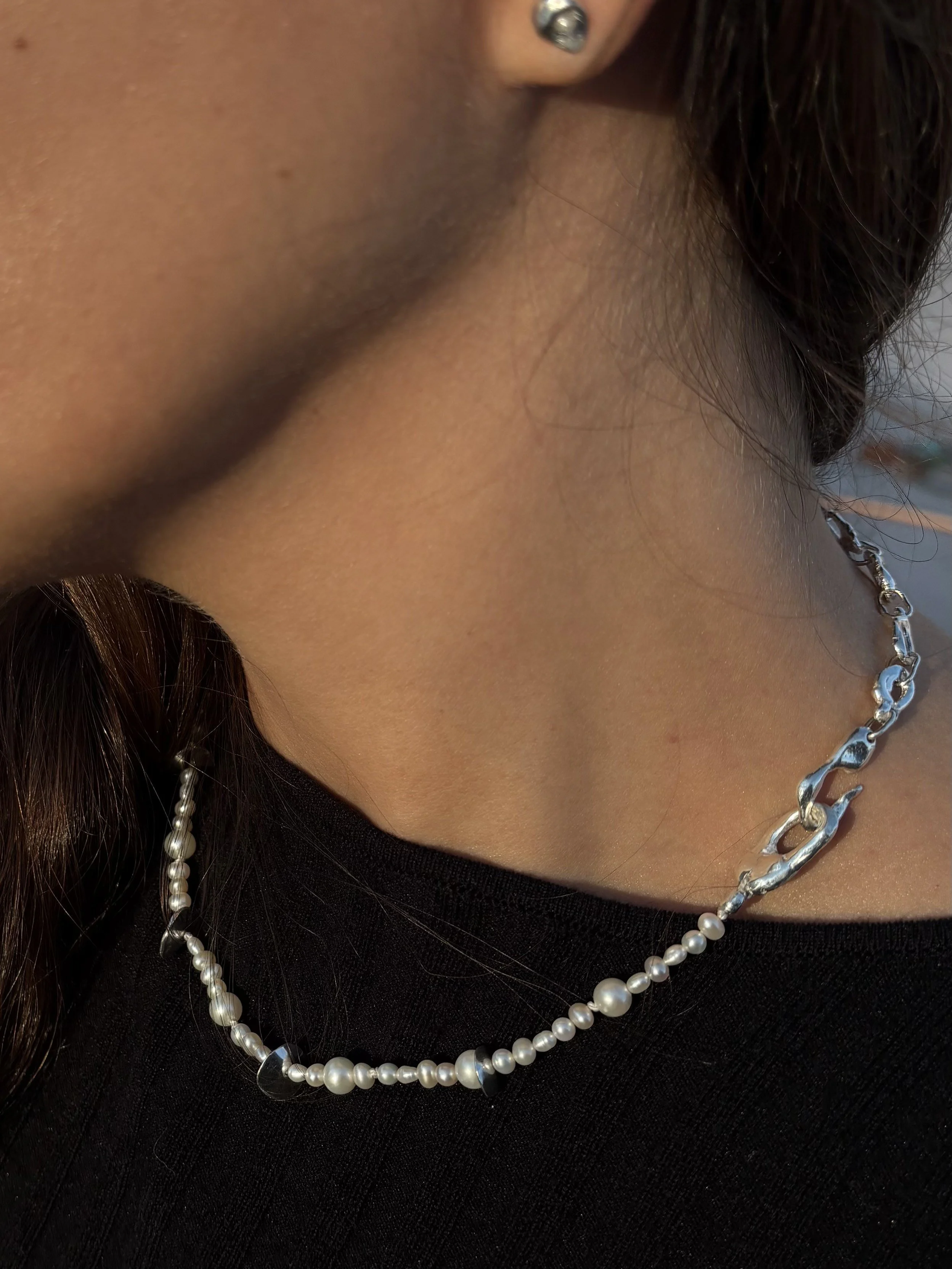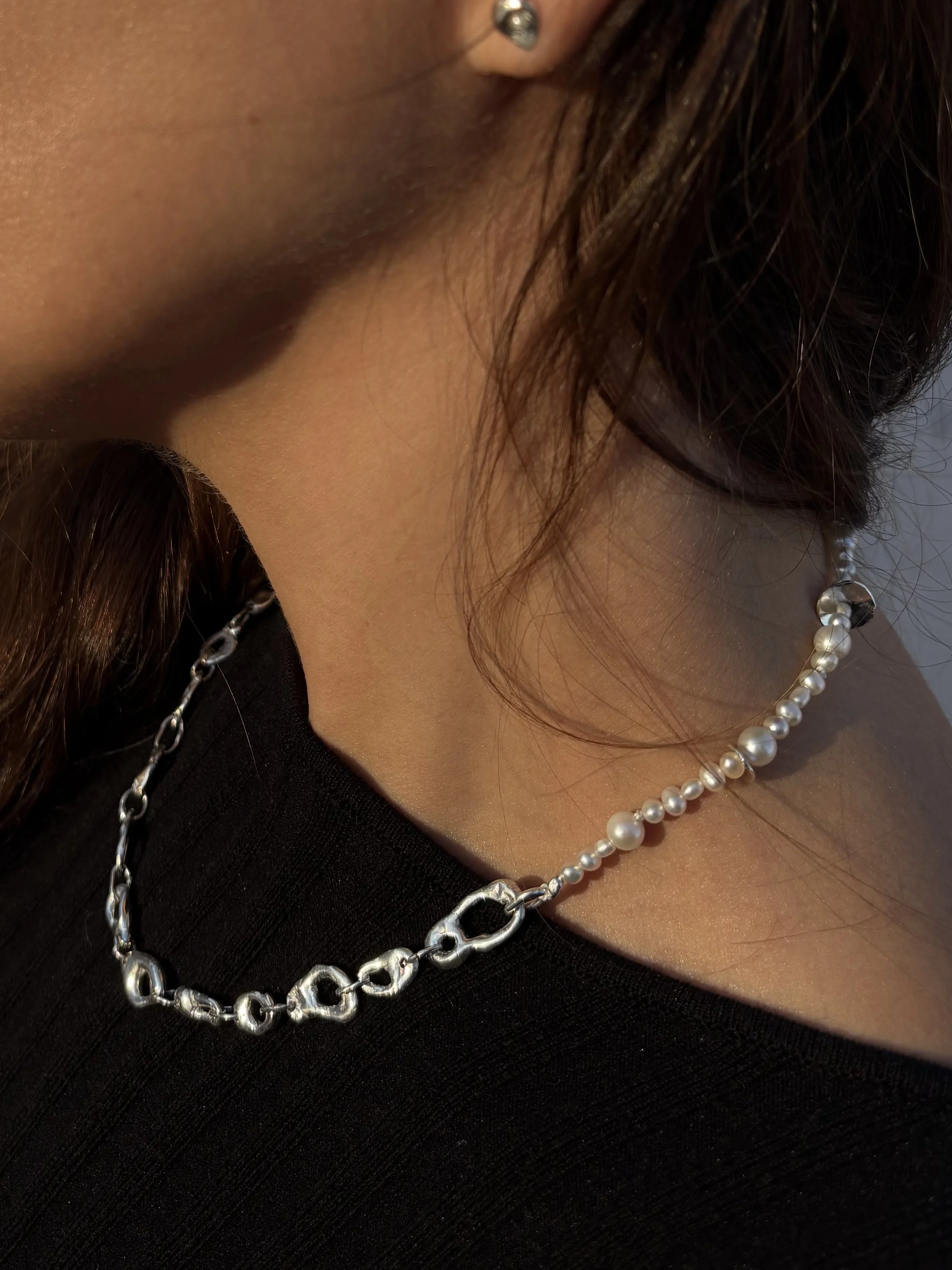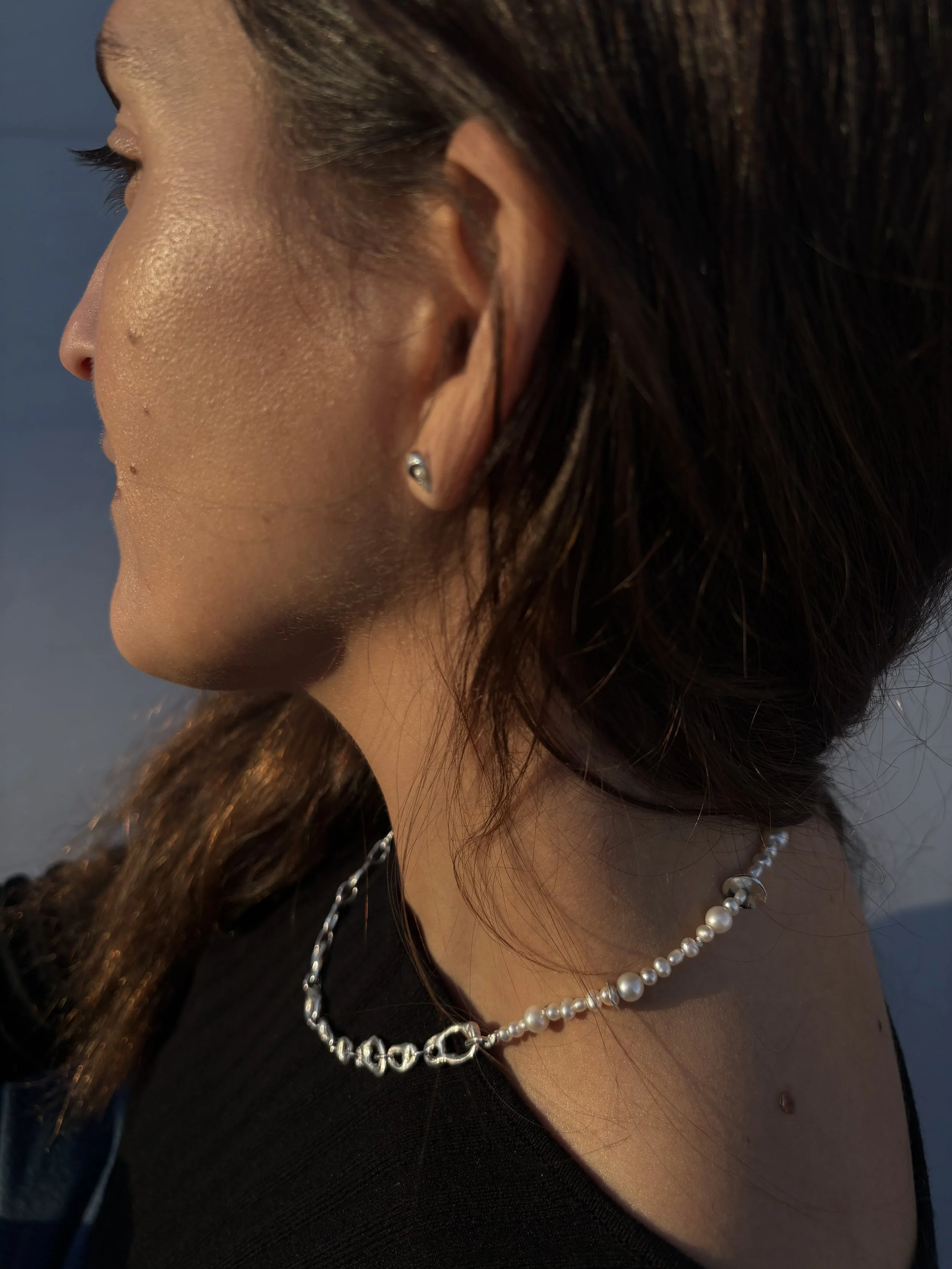 Melted 14k solid gold pebble studs with pressed salt and pepper 2mm diamonds.